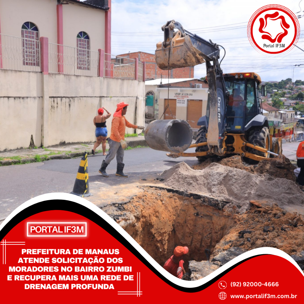 A Prefeitura de Manaus, por meio da Secretaria Municipal de Infraestrutura (Seminf), atua nesta sexta-feira, 20/2, na rua Berimbau Baiano, no bairro Zumbi dos Palmares, na zona Leste, em atendimento à solicitação dos moradores, com a recuperação da rede de drenagem profunda que se rompeu e formou uma cratera de três metros de profundidade.
