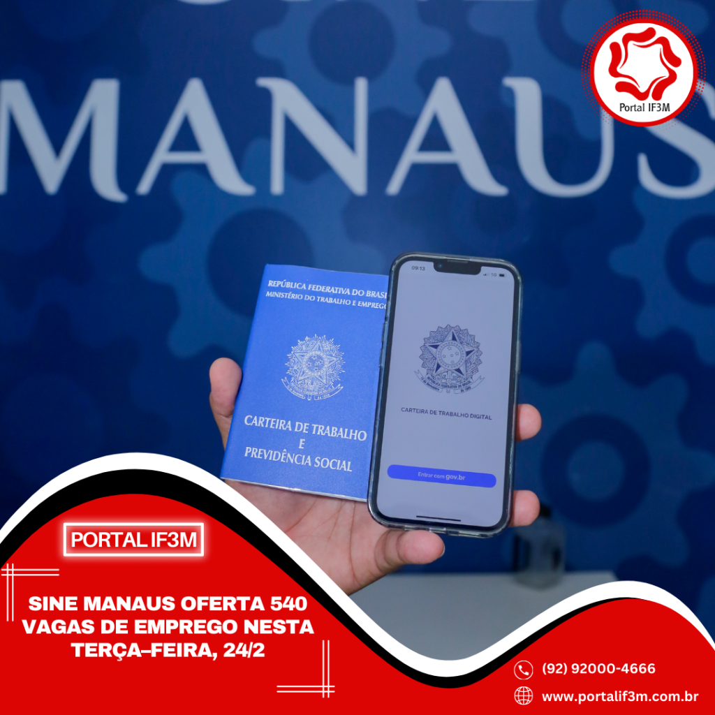 Prefeitura de Manaus, por meio do Sine Manaus, oferta 540 vagas de emprego em várias áreas de atuação, nesta terça–feira, 24/2, das 8h às 14h. O candidato pode validar a Carteira Digital e Previdência Social (CTPS) no aplicativo “Carteira de Trabalho Digital” ou acessar o site http://gov.br/trabalho.