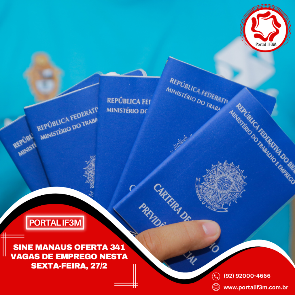 A Prefeitura de Manaus, por meio do Sine Manaus, oferta 341 vagas de emprego em várias áreas de atuação, nesta sexta-feira, 27/2, das 8h às 14h. O candidato pode validar a Carteira Digital e Previdência Social (CTPS) no aplicativo “Carteira de Trabalho Digital” ou acessar o site http://gov.br/trabalho.