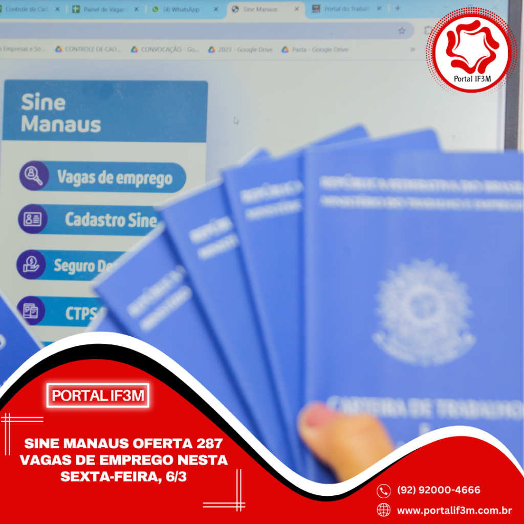 A Prefeitura de Manaus, por meio do Sine Manaus, oferta 287 vagas de emprego em várias áreas de atuação, nesta sexta-feira, 6/3, das 8h às 14h. O candidato pode validar a Carteira Digital e Previdência Social (CTPS) no aplicativo “Carteira de Trabalho Digital” ou acessar o site http://gov.br/trabalho.