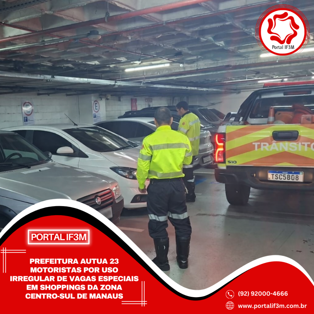 A Prefeitura de Manaus, por meio do Instituto Municipal de Mobilidade Urbana (IMMU), realizou, neste domingo, 8/3, uma operação de fiscalização em dois shopping centers da zona Centro-Sul da capital, após denúncias de motoristas sobre a ocupação irregular de vagas destinadas a Pessoas com Deficiência (PcDs) e mobilidade reduzida.