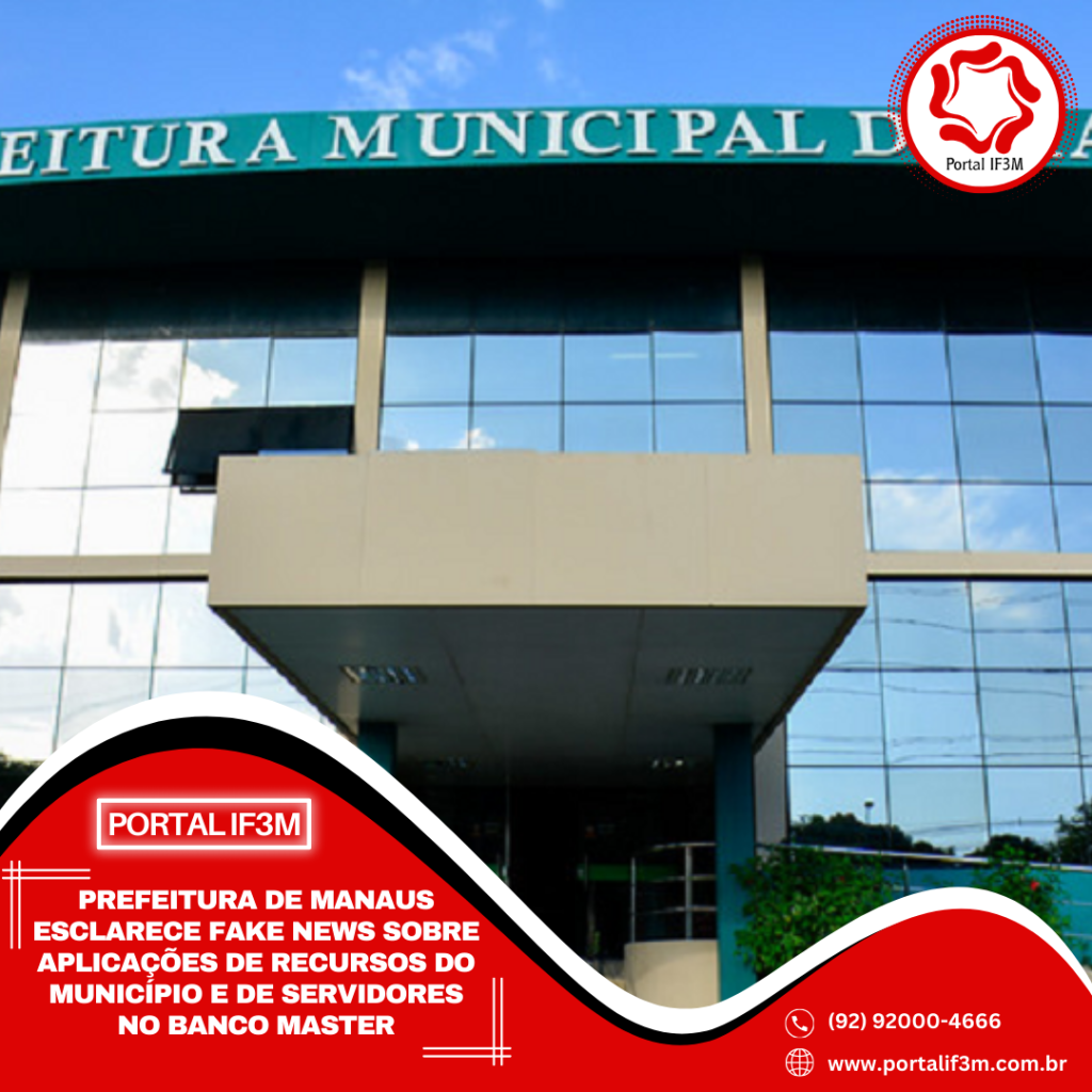 A Prefeitura de Manaus informa que são falsas as notícias sobre a aplicação de recursos seus, de seus servidores ou de contribuintes em instituições do conglomerado Master.