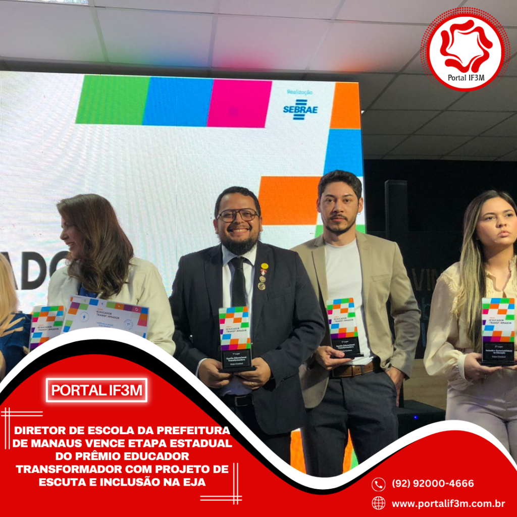 O diretor do Centro Municipal de Educação de Jovens e Adultos (Cemeja) Professor Samuel Benchimol, da Prefeitura de Manaus, Rodrigo Barbosa Froés, venceu a etapa estadual do Prêmio “Educador Transformador” com o projeto “Círculos de Saberes: Protagonismo, Escuta e Inclusão na EJA”, iniciativa que fortalece a permanência dos estudantes por meio da escuta ativa, do diálogo e do incentivo ao protagonismo estudantil. A premiação ocorreu na sede do Serviço Brasileiro de Apoio às Micro e Pequenas Empresas (Sebrae), localizada na avenida Leonardo Malcher, no Centro, zona Sul da capital.