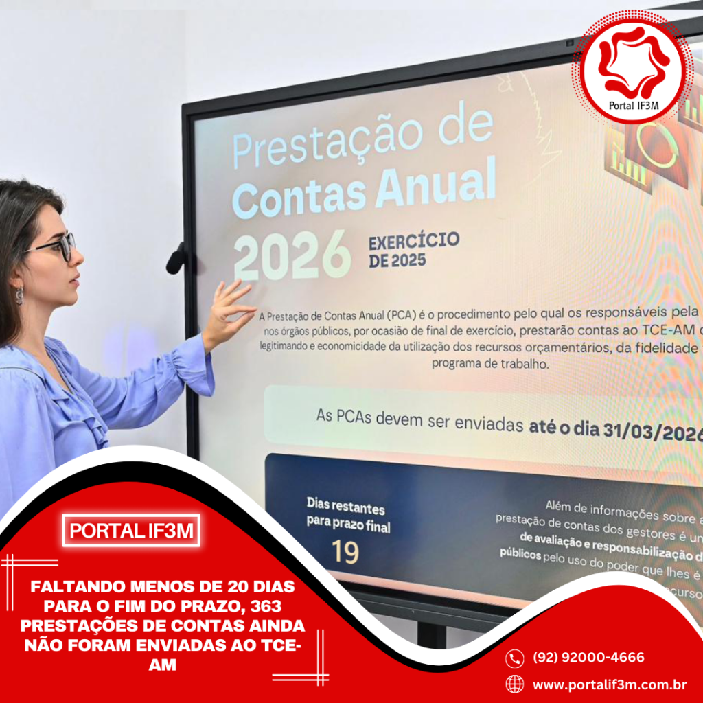 A dezenove dias do prazo final para entrega das Prestações de Contas Anuais (PCAs), o Tribunal de Contas do Amazonas (TCE-AM) recebeu apenas 37 envios referentes ao exercício de 2025. Ao todo, 400 prestações devem ser encaminhadas à Corte de Contas até o dia 31 de março, o que significa que 363 ainda não foram entregues.