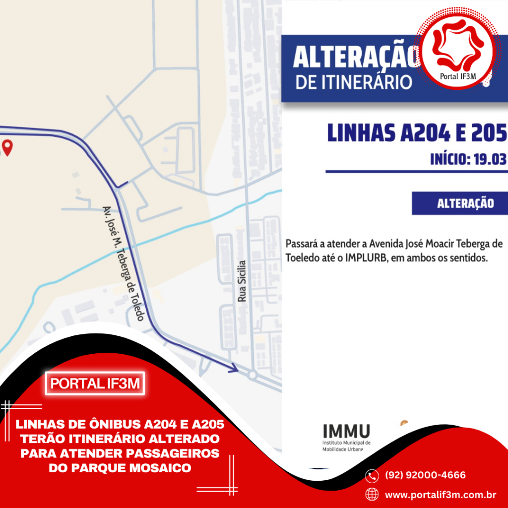 A Prefeitura de Manaus, por meio do Instituto Municipal de Mobilidade Urbana (IMMU), informa que as linhas de ônibus A204 (Parque Mosaico/ Planalto/E2-Arena) e A205 (Planalto/Versalles/Parque Mosaico/ Centro) terão seus itinerários alterados a partir desta quinta-feira, 19/3.