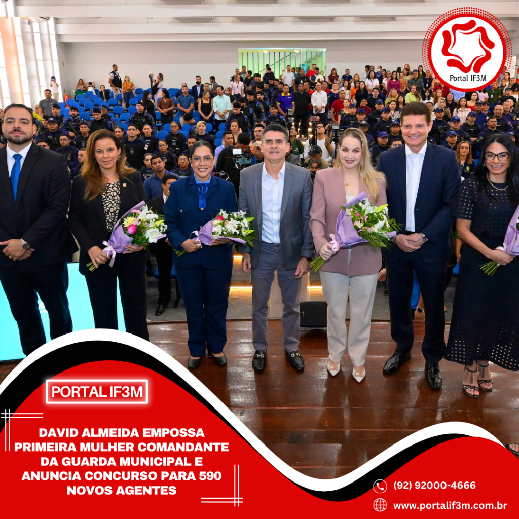 O prefeito de Manaus, David Almeida, oficializou, nesta sexta-feira, 6/3, a posse da nova comandante e do novo subcomandante da Guarda Municipal de Manaus (GMM) e anunciou a ampliação do efetivo da corporação com a realização de concurso público para 590 novos guardas municipais. A solenidade ocorreu no auditório Isabel Victoria de Mattos Pereira do Carmo Ribeiro, na sede da prefeitura, no bairro Compensa, zona Oeste da capital, e marcou também a formatura da primeira turma do curso Guardiã Maria da Penha.