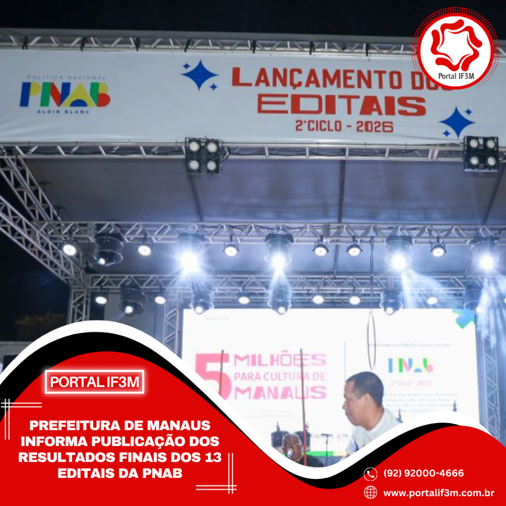Prefeitura de Manaus, por meio do Conselho Municipal de Cultura (Concultura), informa que foram republicados no Diário Oficial do Município (DOM) do dia 23/3, caderno 3, os 13 resultados finais dos 13 Editais da Política Nacional Aldir Blanc (Pnab). A republicação foi realizada por ter sido veiculada com incorreções no DOM 6272, caderno 3, de 17 de março.