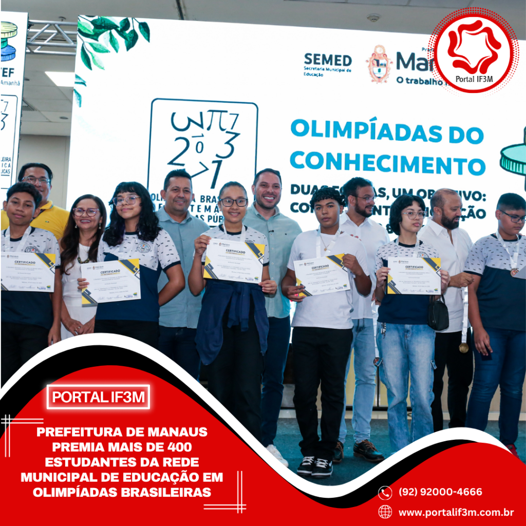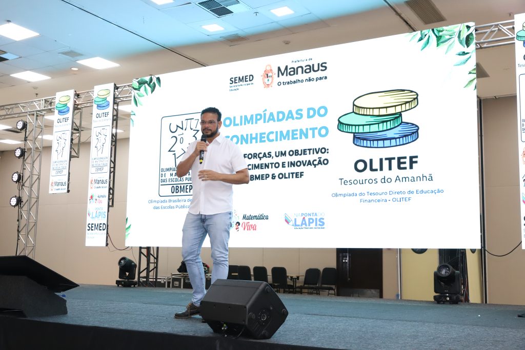 Prefeitura de Manaus, por meio da Secretaria Municipal de Educação (Semed), realizou, nesta terça-feira, 24/3, a premiação “Olimpíadas do Conhecimento”, alusiva à 19ª e à 20ª edições da Olimpíada Brasileira de Matemática das Escolas Públicas (Obmep) e às edições de 2024 e 2025 da Olimpíada do Tesouro Direto de Educação Financeira (Olitef). As duas iniciativas envolveram alunos do 6º ao 9º ano do ensino fundamental. A cerimônia aconteceu no Plaza Shopping & Centro de Convenções, localizado na avenida Djalma Batista, no bairro Chapada, zona Centro-Sul da cidade.