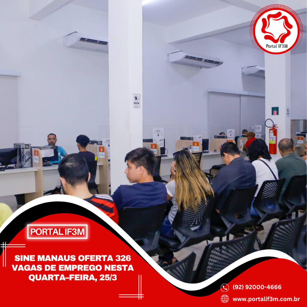 Prefeitura de Manaus, por meio do Sine Manaus, oferta 326 vagas de emprego em várias áreas de atuação, nesta quarta–feira, 25/3, das 8h às 14h. O candidato pode validar a Carteira Digital e Previdência Social (CTPS) no aplicativo “Carteira de Trabalho Digital” ou acessar o site http://gov.br/trabalho.