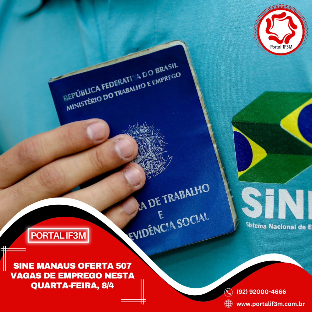 A Prefeitura de Manaus, por meio do Sine Manaus, oferta 507 vagas de emprego em várias áreas de atuação, nesta quarta-feira, 8/4, das 8h às 14h. O candidato pode validar a Carteira Digital e Previdência Social (CTPS) no aplicativo “Carteira de Trabalho Digital” ou acessar o site http://gov.br/trabalho.