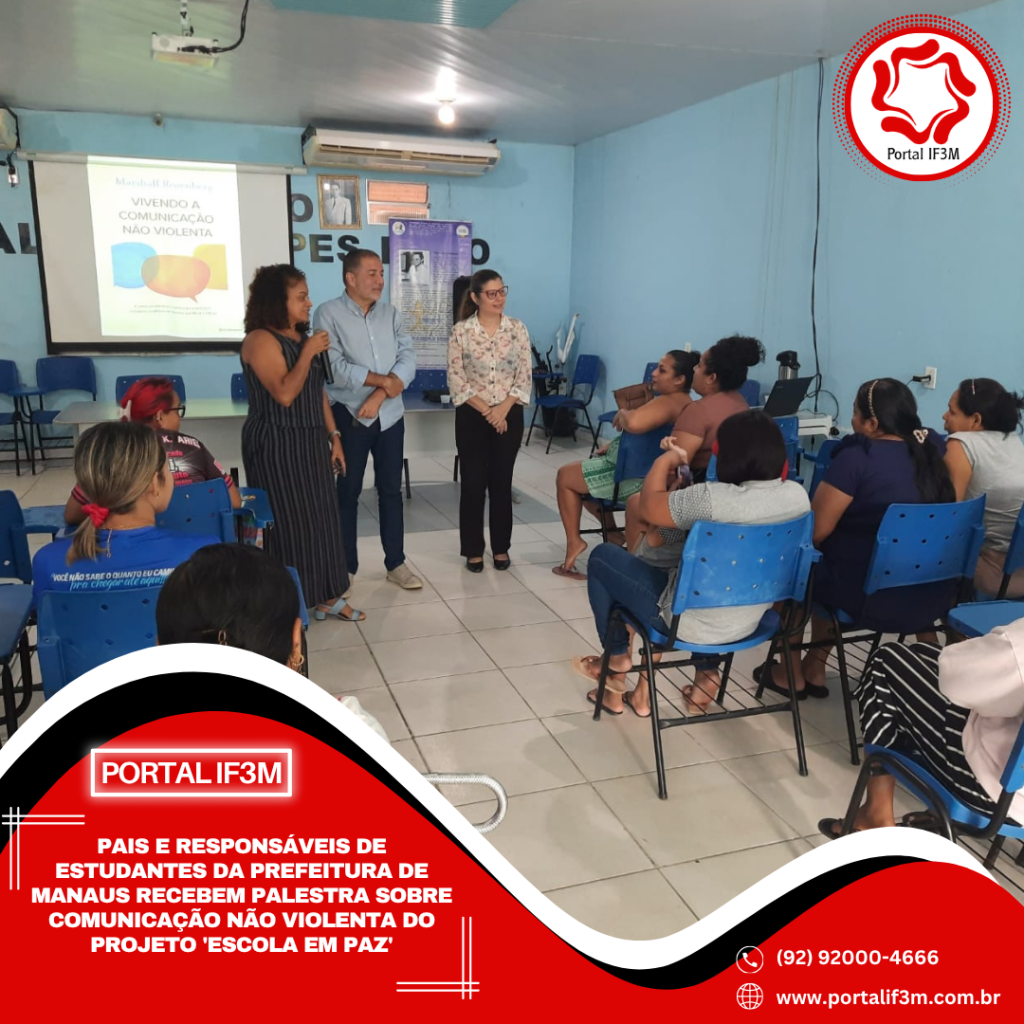 Com o objetivo de fortalecer o diálogo entre família e escola, a Prefeitura de Manaus, por meio da Secretaria Municipal de Educação (Semed), realizou, nesta quinta-feira, 16/4, uma palestra sobre comunicação não violenta voltada aos pais e responsáveis dos estudantes do 6º ao 9º ano da escola municipal Violeta de Matos Areosa, localizada no bairro Colônia Antônio Aleixo, zona Leste da capital. A atividade integra as ações do projeto “Escola em Paz”.