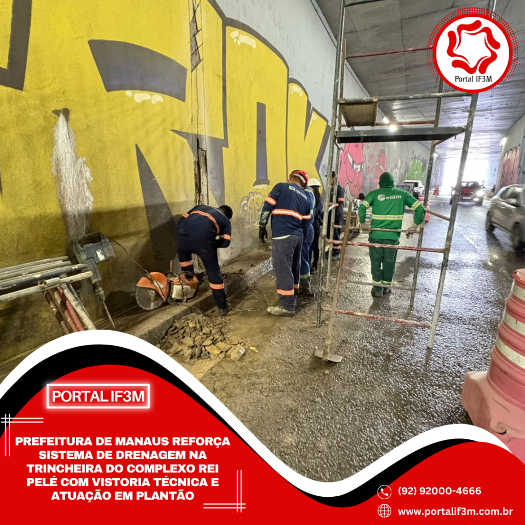 A Prefeitura de Manaus, por meio da Secretaria Municipal de Infraestrutura (Seminf), executa, nesta segunda-feira, 20/4, uma ação de manutenção com foco no sistema de drenagem da trincheira do complexo viário Rei Pelé, no bairro Jorge Teixeira, zona Leste da capital. A intervenção ocorre durante o plantão de serviços essenciais e foi acompanhada de perto pelo secretário municipal de Infraestrutura, Madson Rodrigues, que realizou vistoria técnica no local.