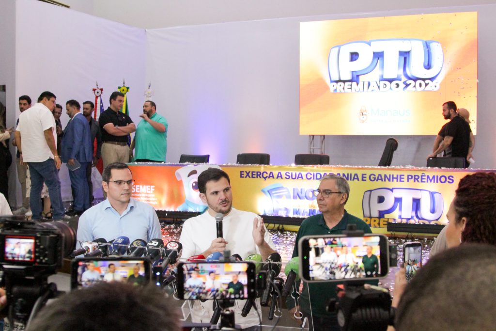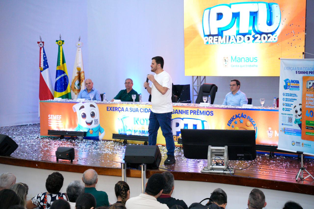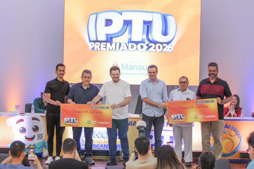 O prefeito de Manaus, Renato Junior, entregou, nesta quinta-feira, 23/4, os cheques simbólicos aos contemplados do primeiro sorteio do ano da campanha “IPTU Premiado 2026” com prêmio de até R$ 1 milhão, no auditório Isabel Victoria de Mattos Pereira do Carmo Ribeiro, na sede da prefeitura, no bairro Compensa, zona Oeste da capital. Em cerimônia, o chefe do Executivo municipal destacou o papel do imposto para a manutenção dos serviços públicos, o compromisso da gestão com a transparência do uso dos recursos e assegurou mais premiações para este ano.