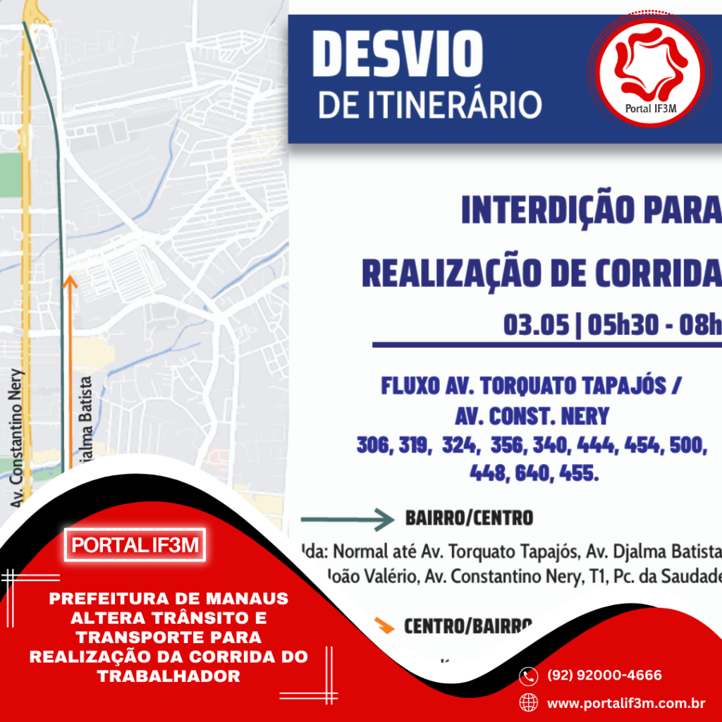 Prefeitura de Manaus, por meio do Instituto Municipal de Mobilidade Urbana (IMMU), vai realizar alterações no trânsito e no transporte coletivo durante a Corrida do Trabalhador, no domingo, 3/5, das 5h30 às 8h. A operação inclui interdições viárias, desvios de itinerário em diversas linhas de ônibus e mudanças temporárias no funcionamento das estações Arena e São Jorge.